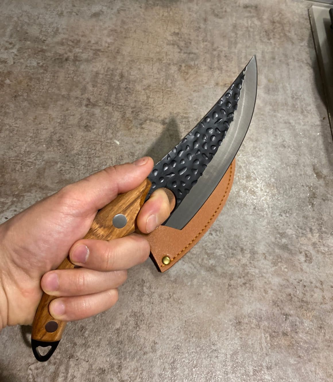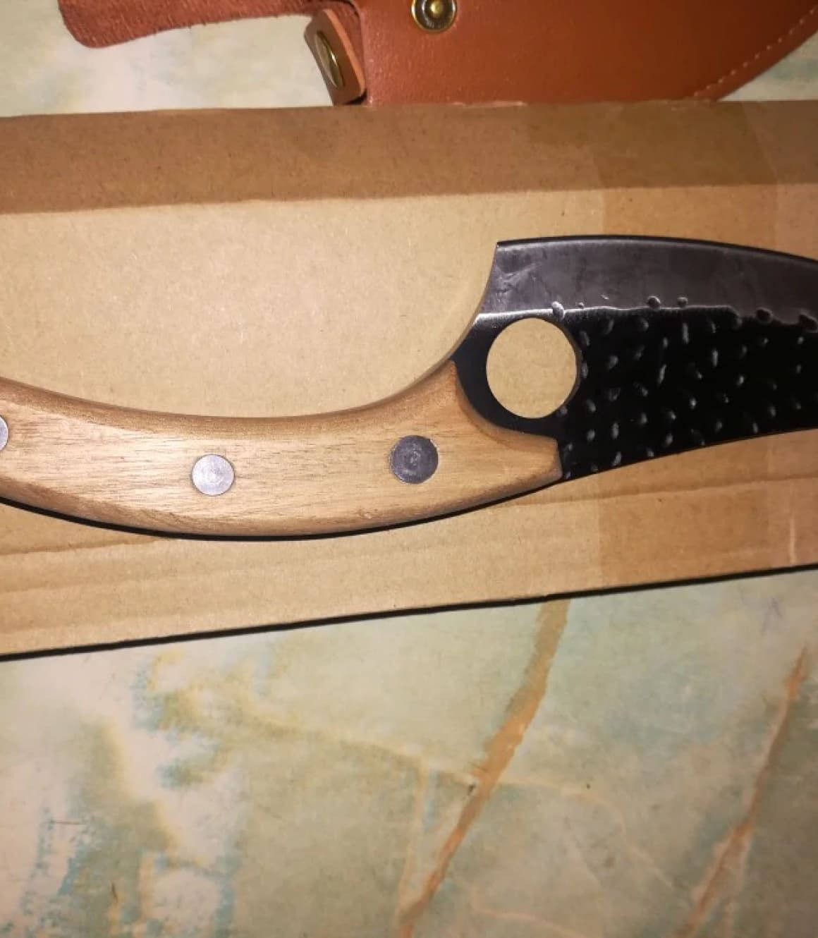 Het mes is precies zoals geadverteerd. Scherp en klaar voor gebruik. Het gat onderaan het lemmet zorgt voor een perfect evenwicht tijdens het gebruik en ik weet zeker dat hij heel lang scherp zal blijven. Ik zal een wetsteen kopen zodat ik die heb voor moest ik die ooit nodig hebben.